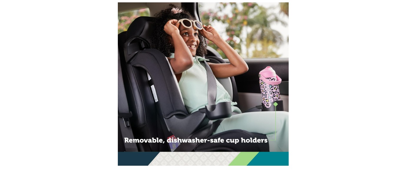 The fabric isn’t the softest, but the removable cover washed well without shrinking or fading. The built-in cup holders were a handy touch, holding drinks and snacks without spills. Overall, the Safety 1st Grand 2-in-1 offers good support without extra bulk, so it fits well in tighter back seats.