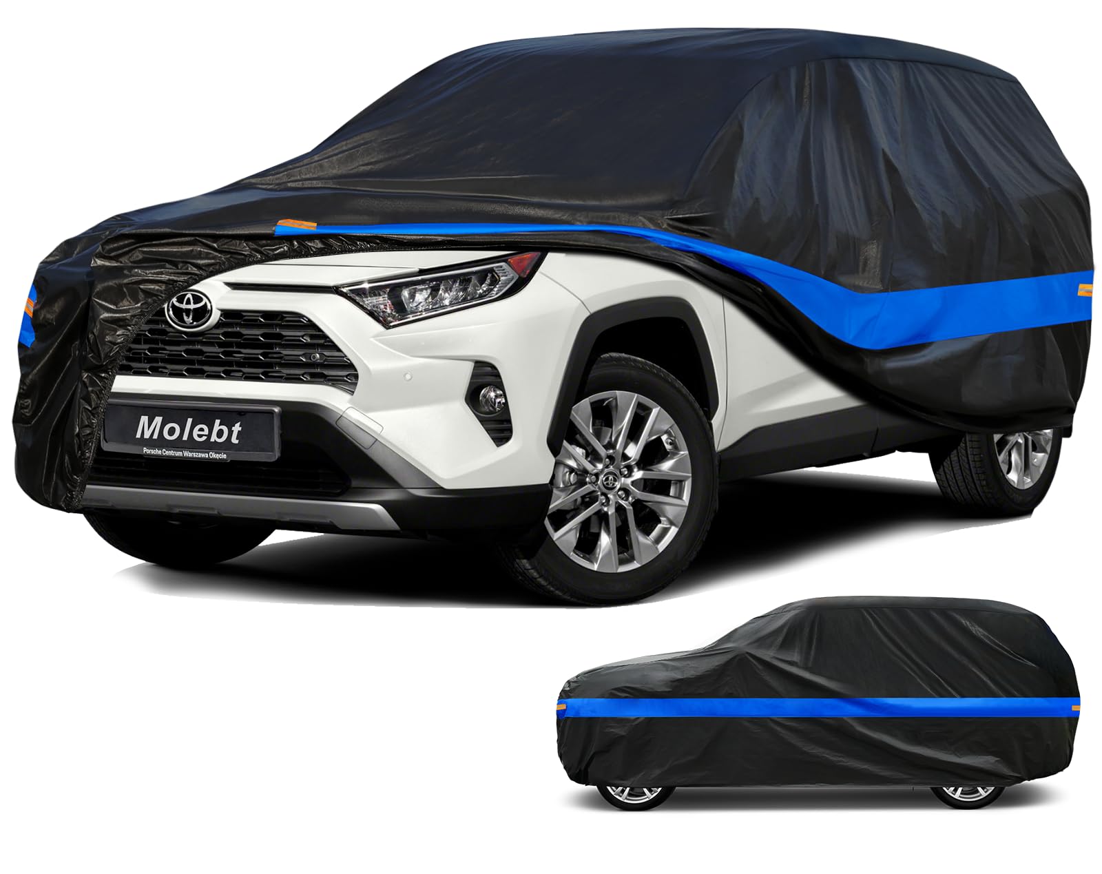 We found the Molebt SUV Car Cover easy to put on without hassle. Its straps really keep it tight during windy days, so there’s no risk of it blowing away. The reflective strips on the corners add safety when parked at night or by the roadside.