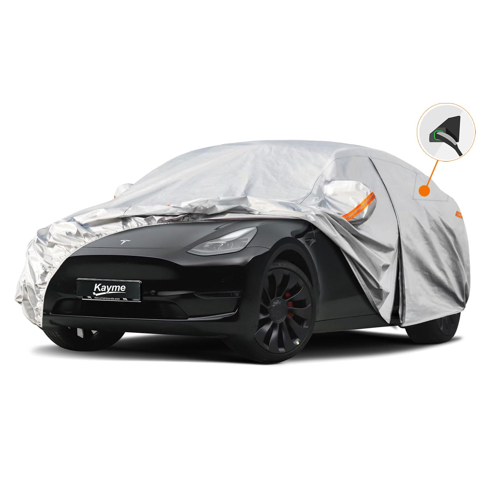 We found the Kayme cover feels durable and thick when handling it. Putting it on the Model Y takes a little effort but the zipper near the driver door saves time getting inside without removing the whole cover.
