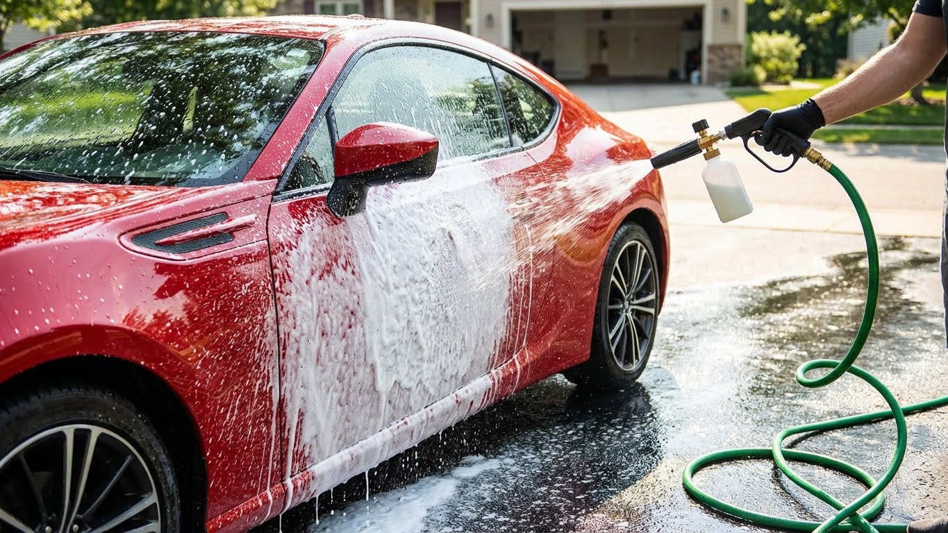 We used the foam gun around the driveway and liked how the suds stuck to the paint. It loosened road film and made the mitt glide more easily, which felt safer for the paint compared with a dry sponge wash.