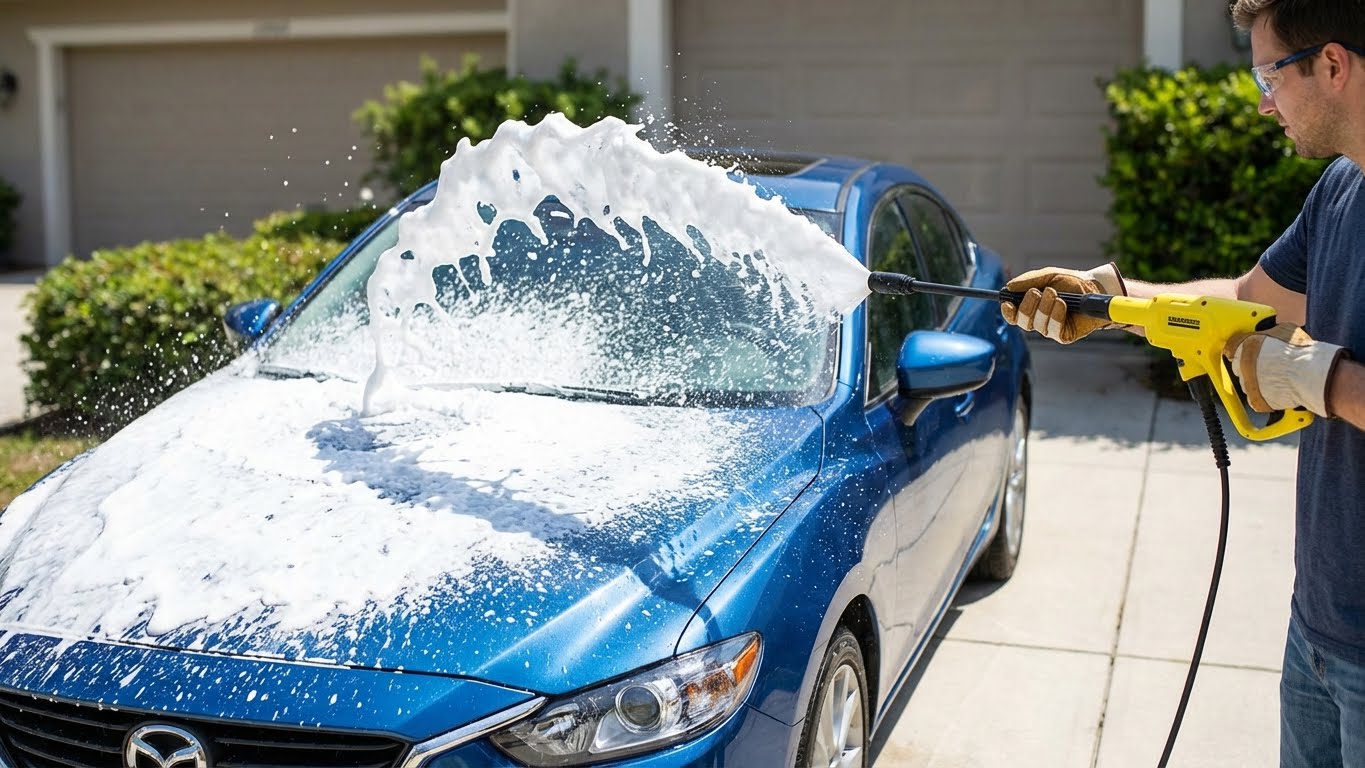 A foam cannon helps loosen dirt and makes rinsing easier. Use car-specific soap only; household detergents can strip wax and harm paint.