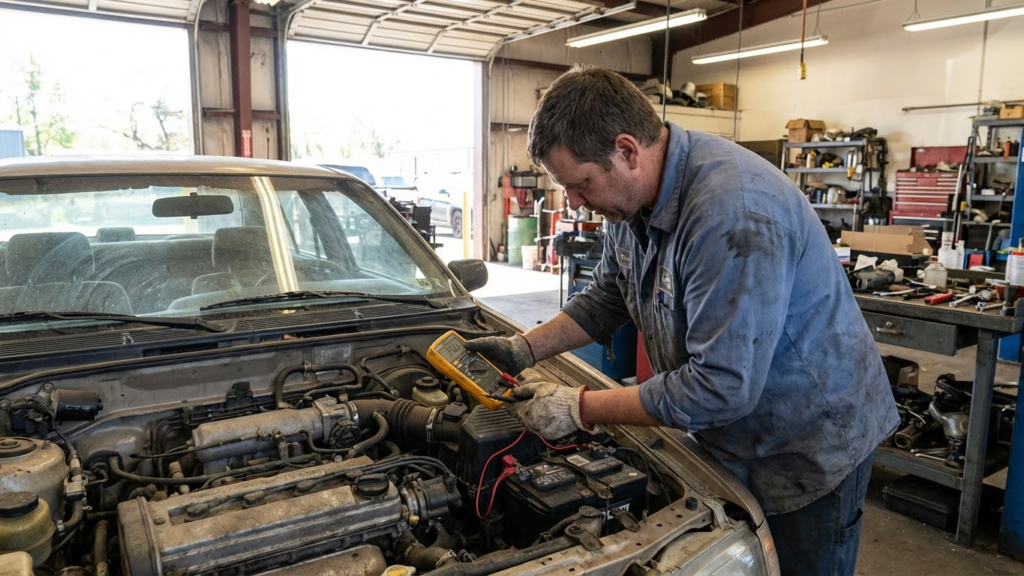 They can check the battery voltage with a multimeter. If the voltage is low, a jumpstart or battery replacement may help. Inspecting battery cables and terminals for corrosion or looseness is also important. If these steps don’t solve it, the starter motor might need testing.