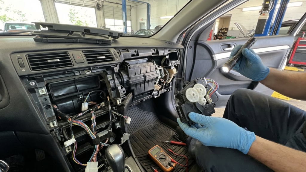 The blend door actuator controls airflow inside the car, adjusting heat and air conditioning. When it fails, it can cause repetitive clicking sounds that seem to come from the dashboard area.
