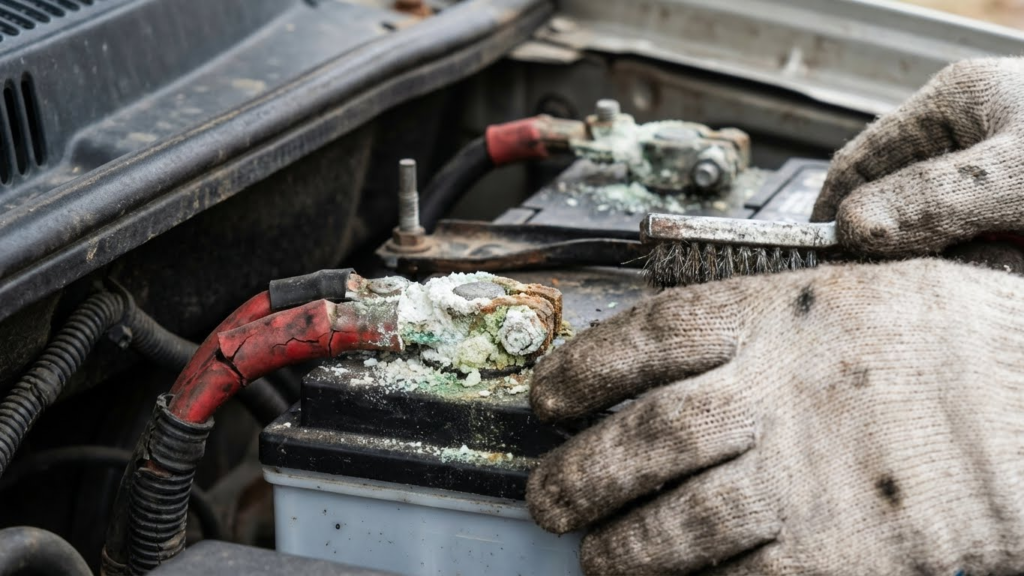 If corrosion is present, cleaning the terminals is necessary. Disconnect the battery cables—always remove the negative (black) cable first—then clean the terminals with a mixture of baking soda and water, scrubbing with a wire brush.