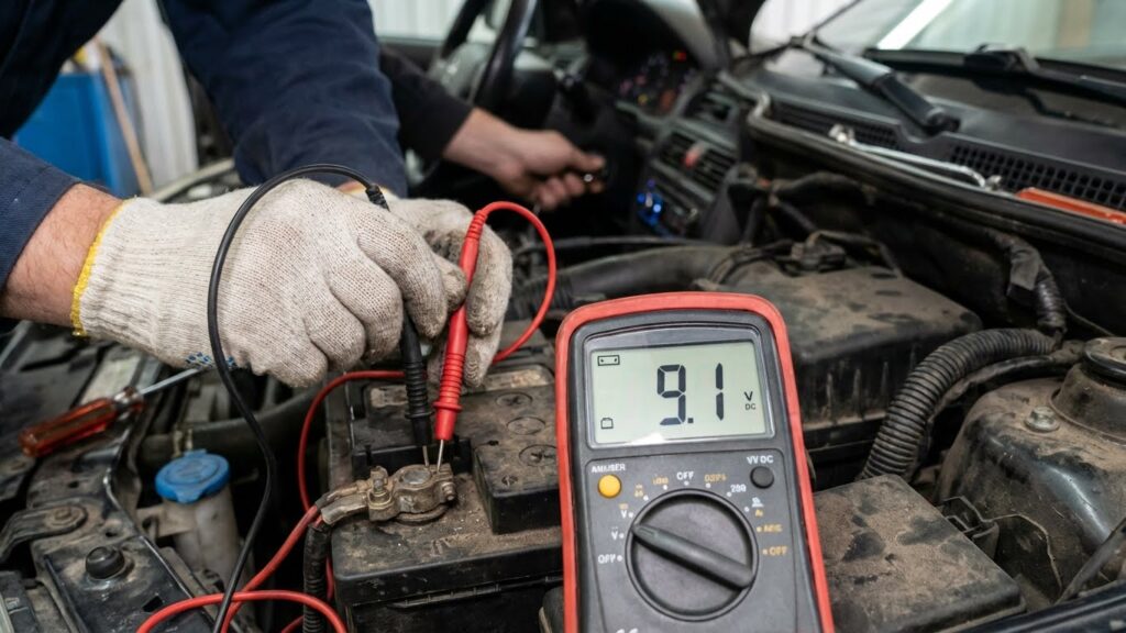 Testing involves measuring battery voltage and checking the starter system. A healthy battery should have about 12.6 volts when the car is off and not less than 10 volts during cranking.