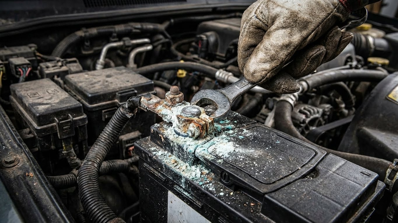 Corrosion looks like white, green, or blue powder around the terminals. Loose cables can move or disconnect during starting.