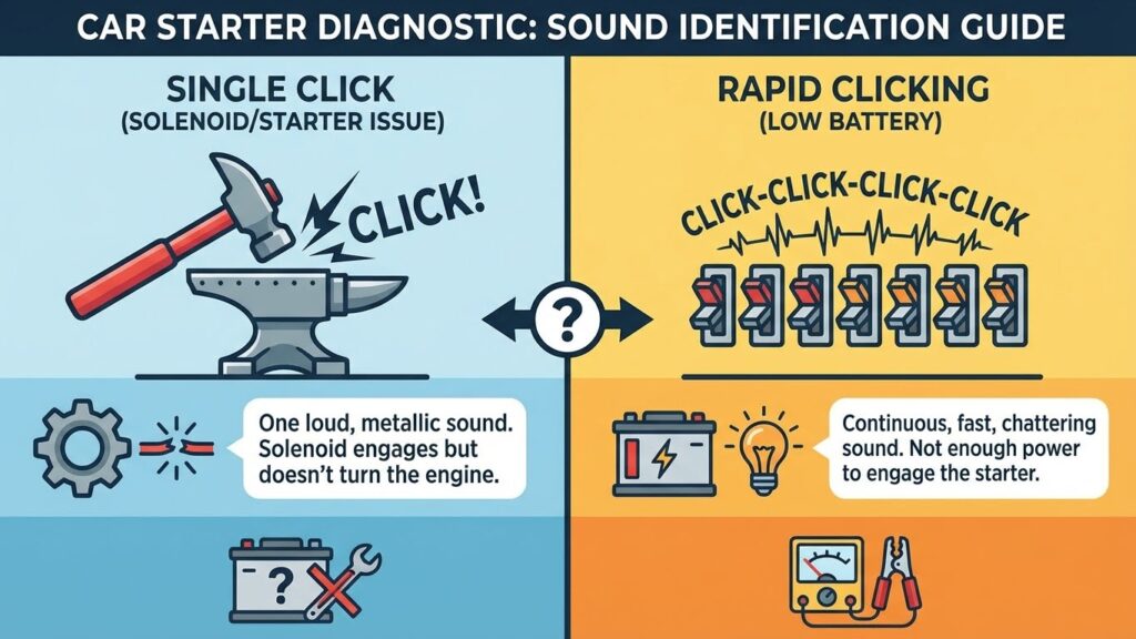 The starter motor turns the engine to start the car. When it fails, the solenoid inside may still click because it tries to engage, but the motor doesn’t spin the engine. This creates a rapid clicking or single click sound without the engine turning over.